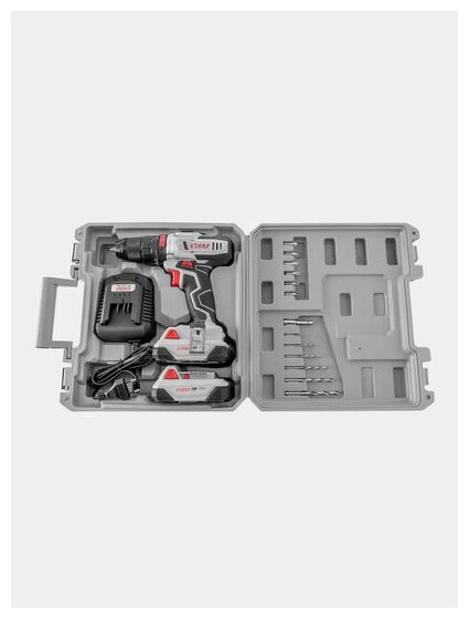 Drill driver STAVR DA-18/2 UK - 1 pc., battery - 2 pcs., charger - 1 pc., clip - 1 pc., bit - 6 pcs., adapter for bits - 1 pc., drill - 6 pcs., plastic case