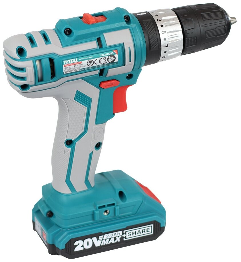 Power supply: battery, battery voltage: 20 V, maximum torque: 45 Nm, number of batteries included: 2, chuck type: keyless, battery type: Li-Ion, number of operating speeds: 2, type:
