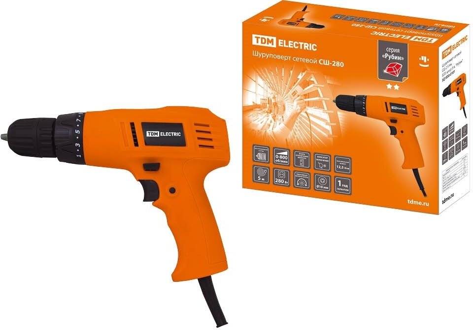 Power supply: from the mains, maximum torque: 12.50 Nm, power consumption: 280 W, chuck type: keyless, design features: power button lock, packaging: box, weight: 1.20 kg, number of speeds