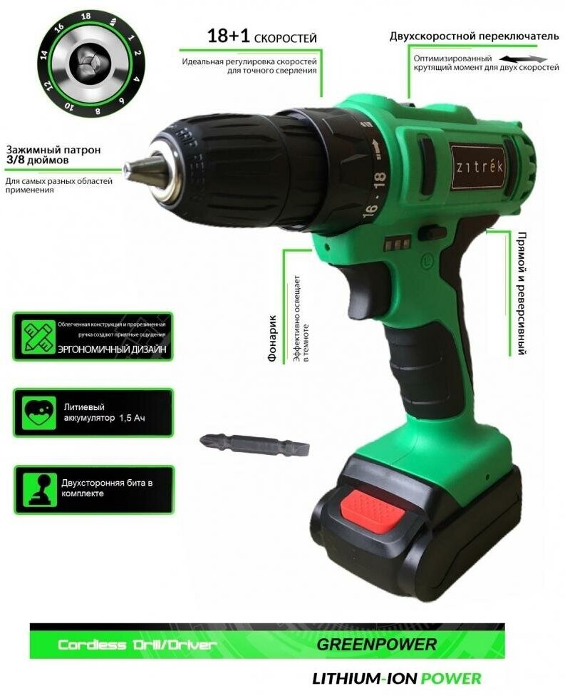 Lithium battery 1.5Ah - 2 pcs., double-sided bit - 1 pc., charger - 1 pc., instruction manual - 1 pc., plastic case - 1 pc.