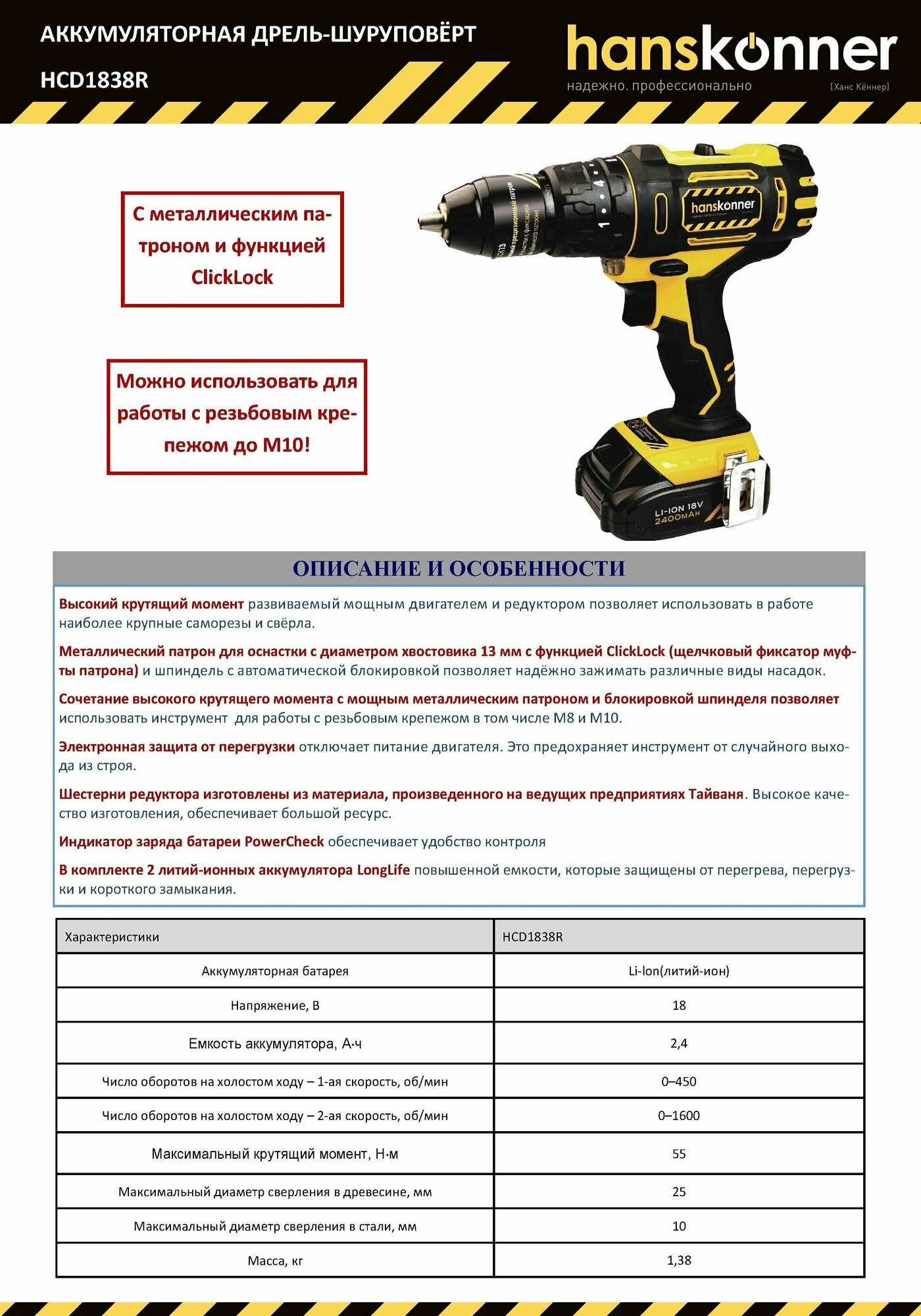 Overload protection, reverse, speed control, motor brake, spindle lock, backlight, motor brake, reverse, spindle lock