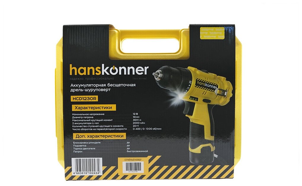 Drill driver Hanskonner HCD1230R2669, Battery powered, 12 V, 30 Nm, 2 batteries