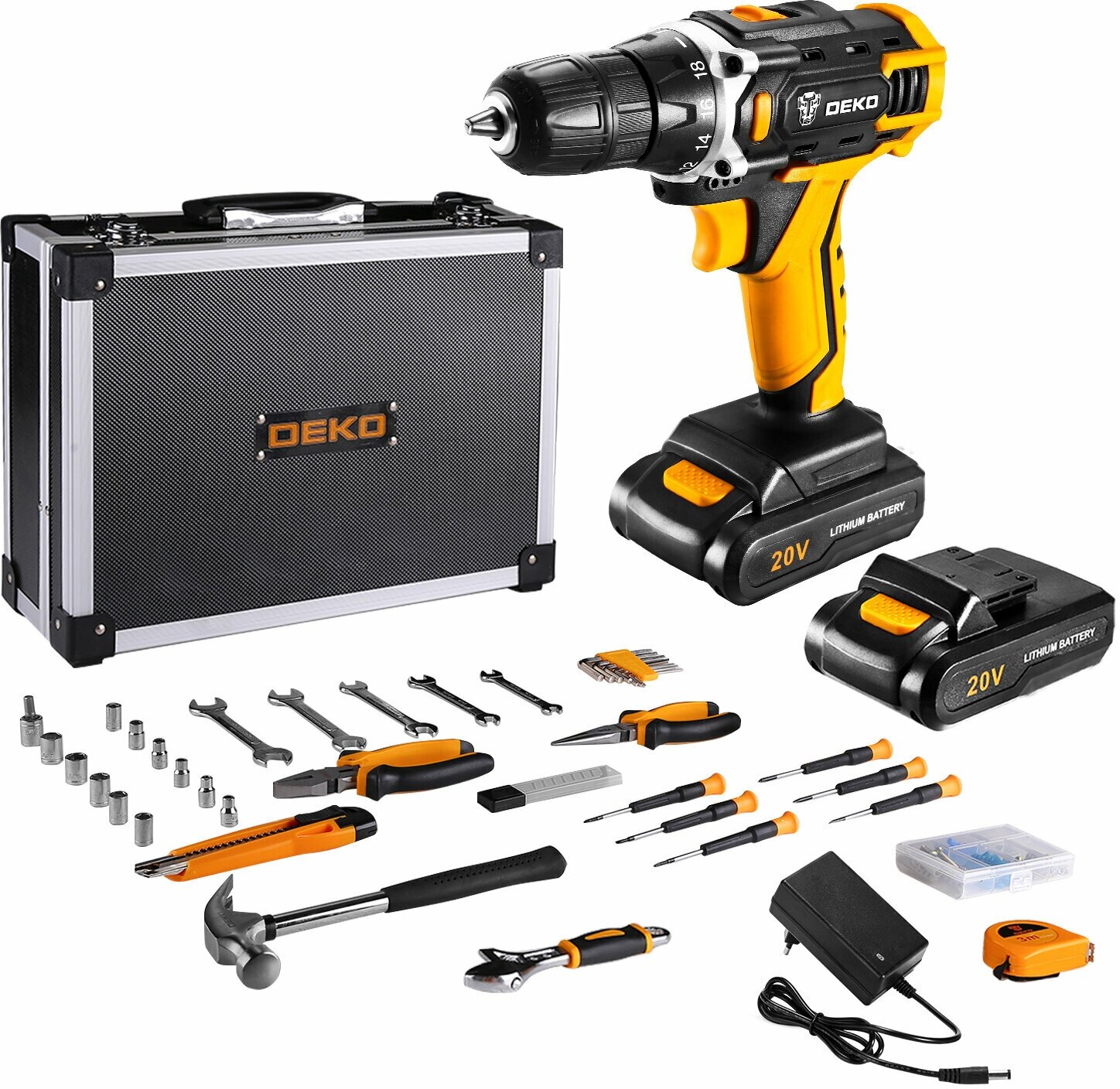1 pc cordless drill 2 pcs battery 1 pc charger 10 pcs 18mm knife blades 5 pcs wrenches 6*7.8*9.10*11.12*13.14*15mm 6 pcs SL2.0 precision screwdrivers, 2.4,3.0, PH000,00,0