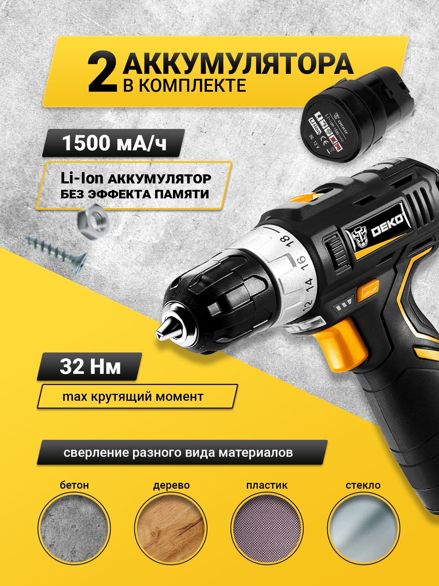 Drill driver DEKO GCD12DU3, battery - 2 pcs., charger, bits - 6 pcs., drills - 6 pcs., bit extension, case
