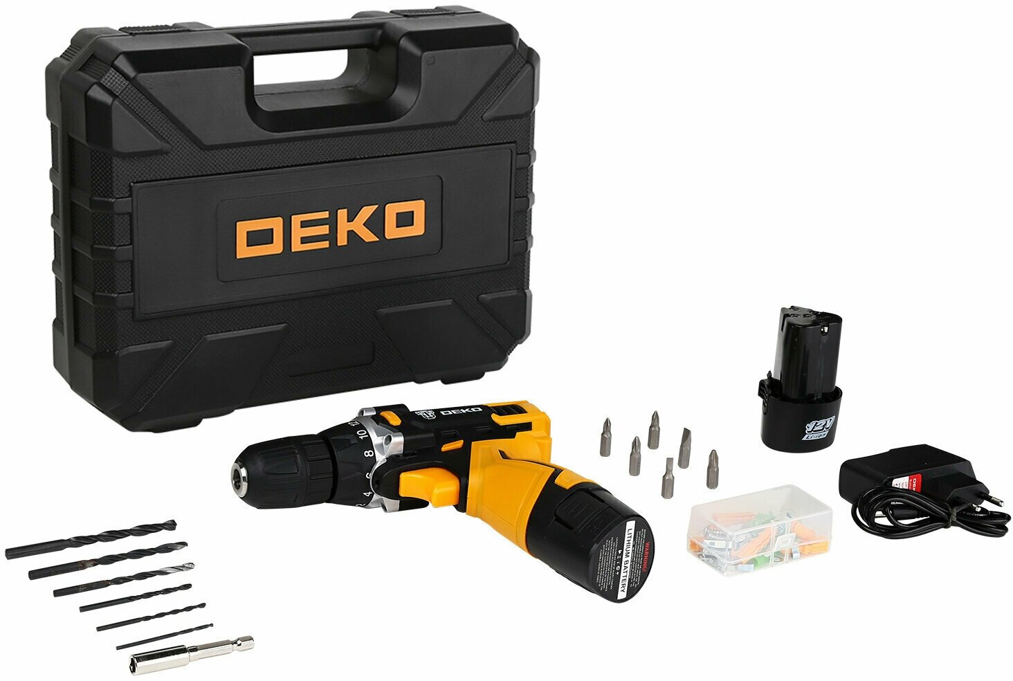 Supplied in a set consisting of: Additional battery - 1 pc. Bits - 6pcs Drill bits - 6pcs Bit extension - 1pc Set of fasteners - 49pcs