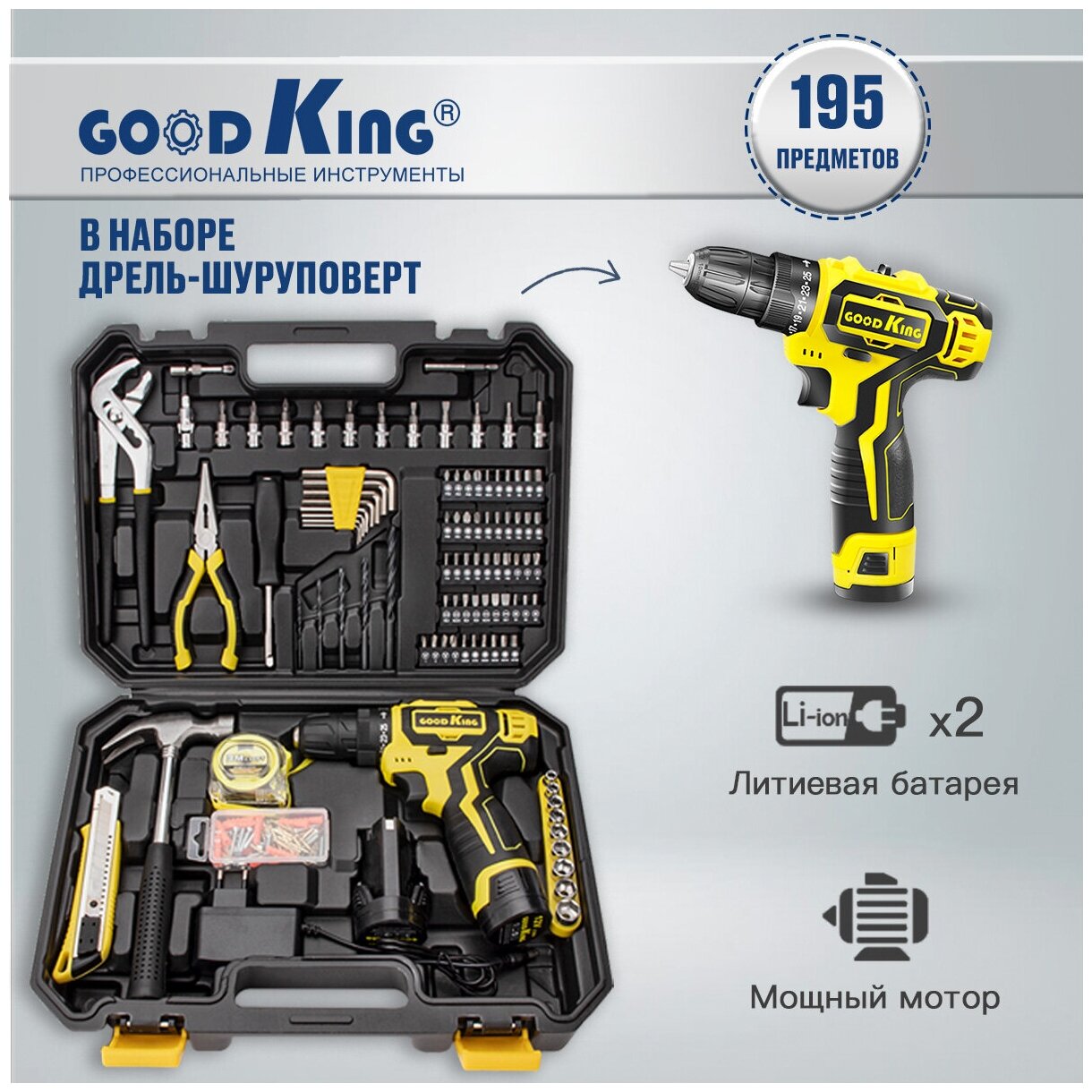 Complete set: Screwdriver 30N.M 3/8"10mm 0-1350/min0-550r/min – 1 pc Battery Li-ion 12V 1.5Ah - 2 pcs Charger – 1 pc Bits - 50 pcs TW 1,2,3,4 ; H 3/32, 1/8, 9/64, 5/32, 3/16, 7/32; PZ 0,1,2,3; T 10,15,20,25,27,30; Torx 10 , 15, 20, 25, 27, 30; Torx with h