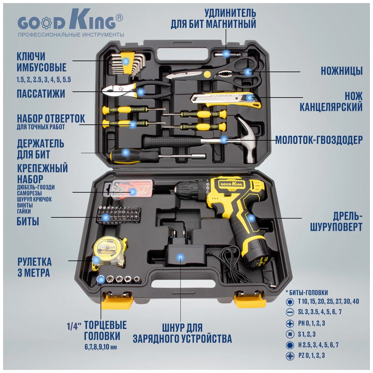 · Drill driver 12v., 30nm · 1 acb 12v. 1.5Ah. · Adapter extension for magnetic bits · Power adapter for acb · Tape measure 3m · Set of 8pcs imbus keys: 6, 5.5, 5, 4, 3, 2.5, 2, 1.5mm · Pliers · Scissors · Set of screwdrivers for precision work