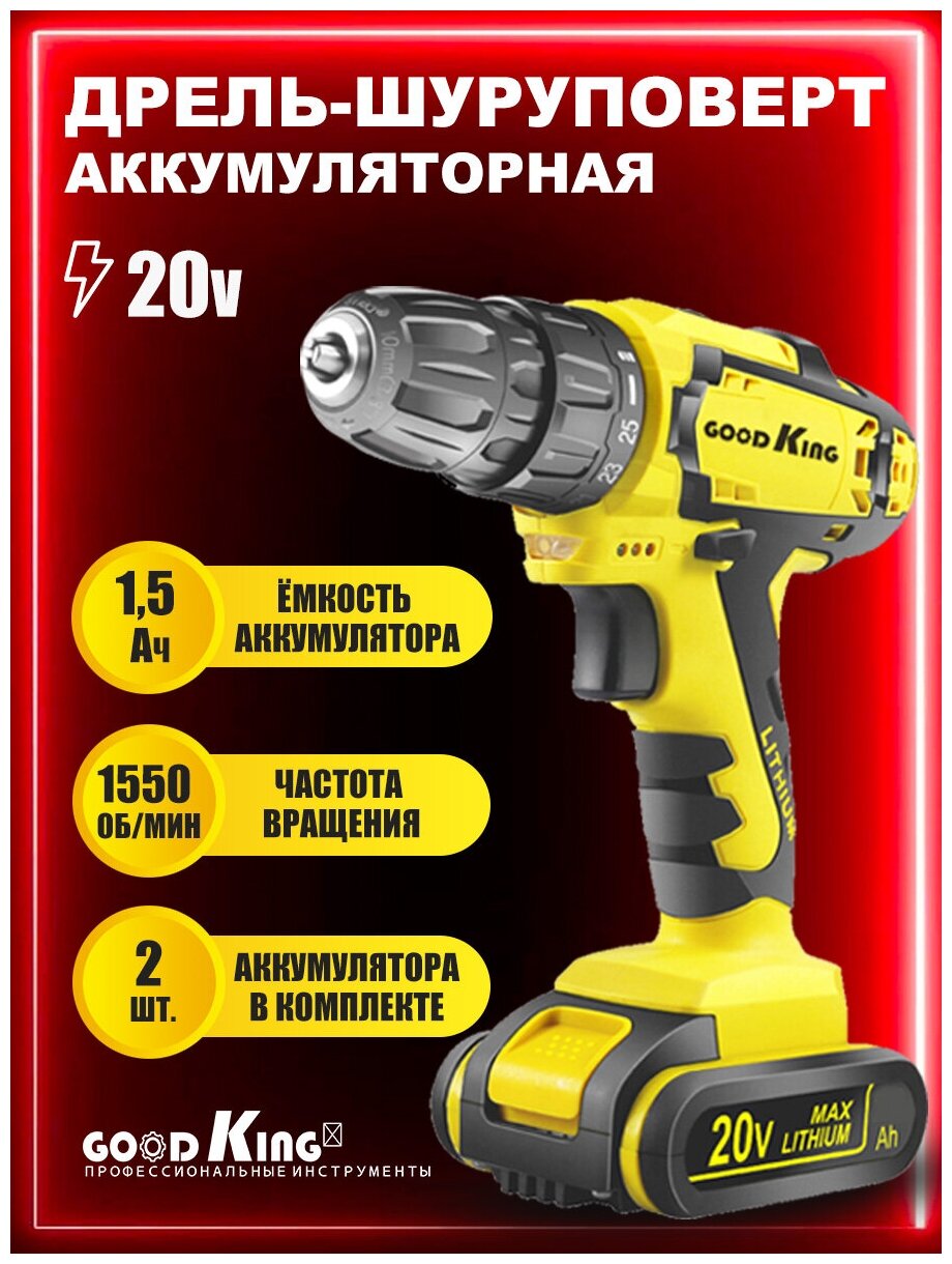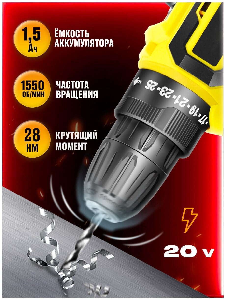 Drill driver 20 V, 40 N*m, 2 pcs. Lithium-ion battery 20 V, 2 Ah 1 pc. Charger The set is supplied in a cardboard box.