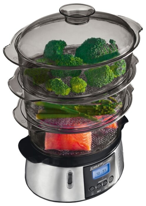 Number of tiers: 3, features: auto-off by timer, adding water during cooking, delayed start, "quick steam" mode, timer, design features: display, power indicator, water level indicator,