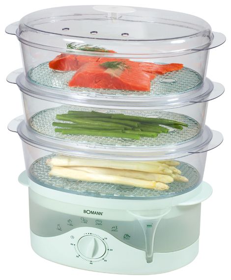 Number of tiers: 3, features: topping up water during cooking, timer, design features: water level indicator, steam basket material: transparent plastic, maximum power consumption: 750 W