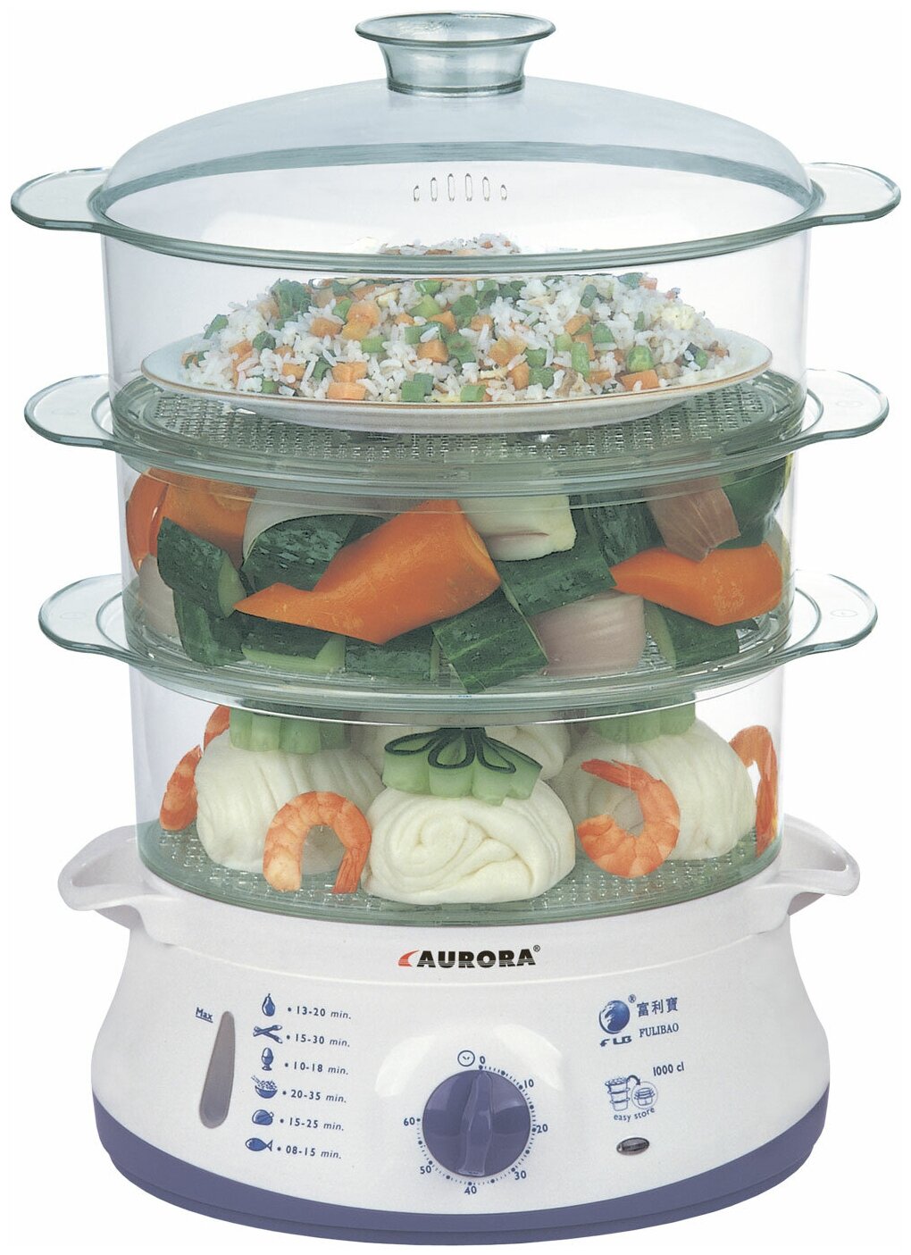 Number of tiers: 3, features: auto-off by timer, adding water during cooking, timer, design features: power indicator, water level indicator, steam basket material: transparent plastic,