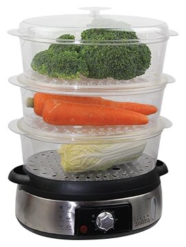 Number of tiers: 3, features: low water cut-off, quick steam mode, timer, design features: power indicator, water level indicator, rice bowl, steam basket material: transparent plastic