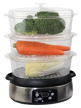 Number of tiers: 3, features: automatic shutdown by timer, shutdown with a lack of water, delayed start, "quick steam" mode, timer, design features: display, power indicator, water level indicator, hour
