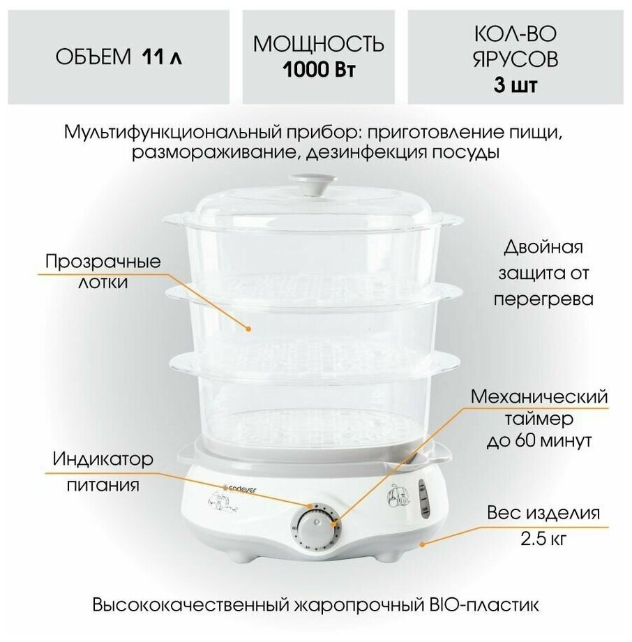 Number of tiers: 3, features: timer, design features: power indicator, steam basket material: transparent plastic, maximum power consumption: 1000 W