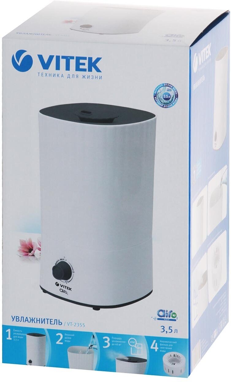 Type: air humidifier, room area: 40 m², humidifier type: ultrasonic, additional functions: fragrance, filters: demineralizing cartridge, water tank volume: 3.50 l, water consumption: 250 ml/h, installation