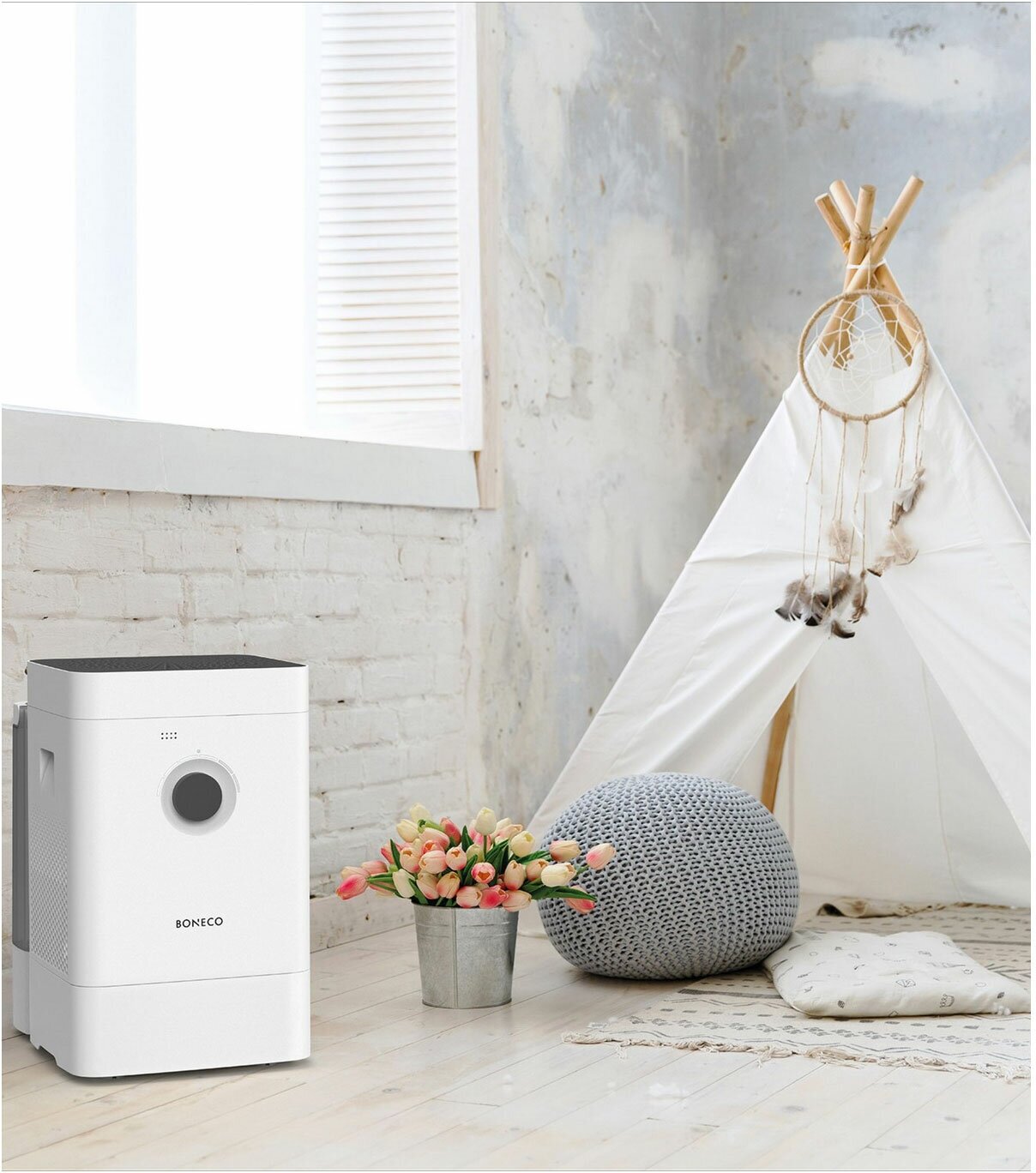 Moisturizing without white deposits on furniture thanks to an effective 3D sponge; operating time up to 1.5 days without topping up water at medium-intensive operation; automatic shutdown at low water level