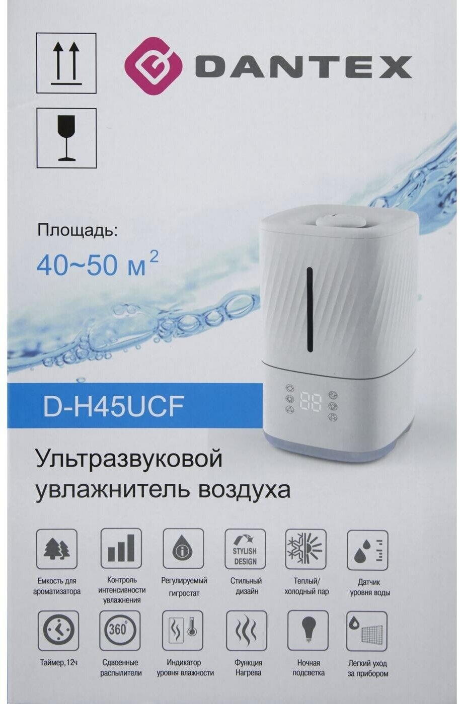 Type: air humidifier, room area: 50 m², humidifier type: ultrasonic, additional functions: aromatization, filters: pre-filters, water tank volume: 4.50 l, water consumption: 400 ml/h, installation: