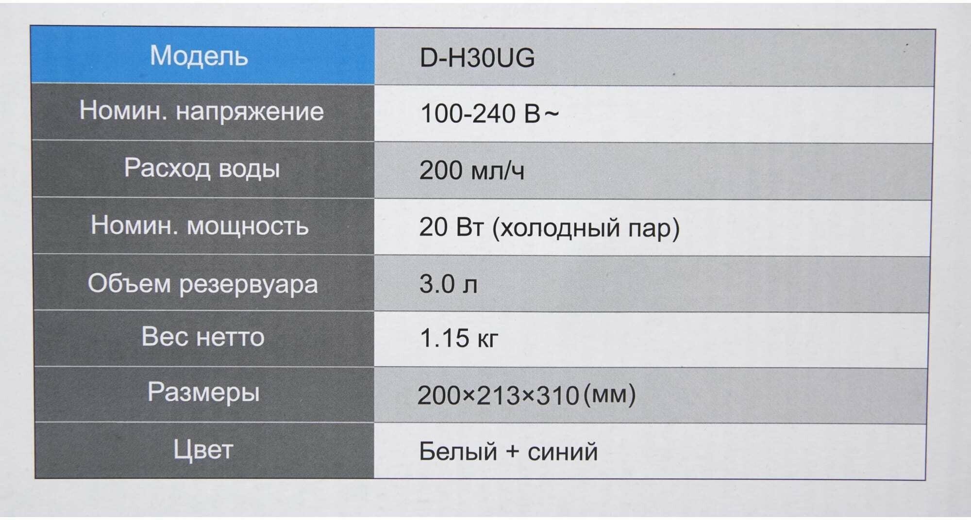 Type: air humidifier, room area: 20 m², type of humidifier: ultrasonic, filters: carbon, water tank volume: 3 l, water flow: 200 ml/h, installation: floor, tabletop, features: speed control