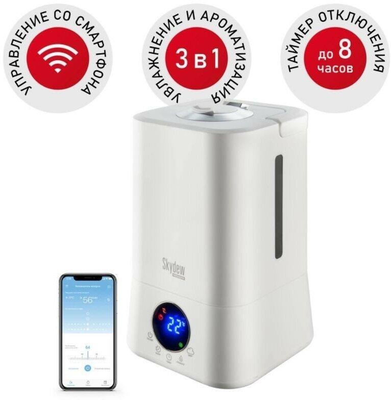 Automatic switch-off when the tank is removed, night mode, humidification level step - 5%, timer for 1, 2, 4 or 8 hours, Remote control with Ready for Sky technology