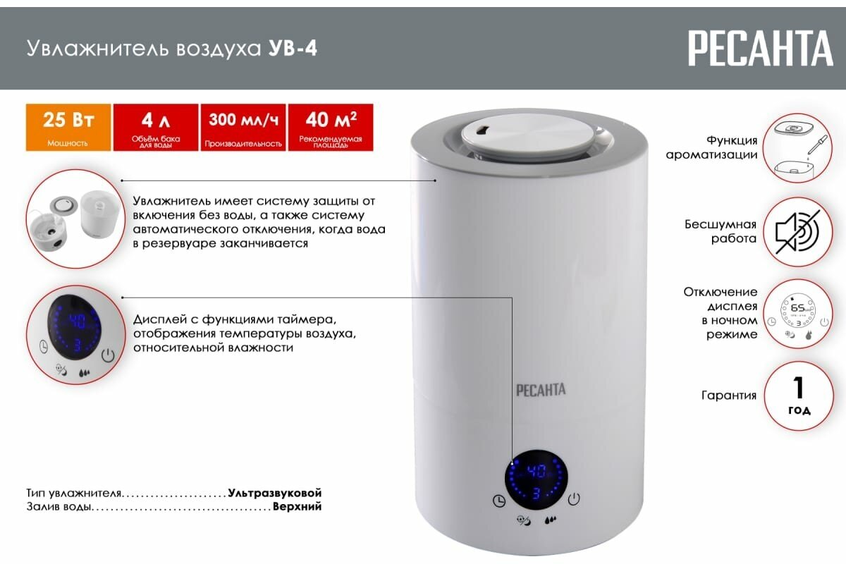 Description: Type: air purifier / humidifier, room area: 40 m², type of humidifier: steam, additional functions: aromatization, ionization, heating, cooling, filters: pre-filters, water tank volume: