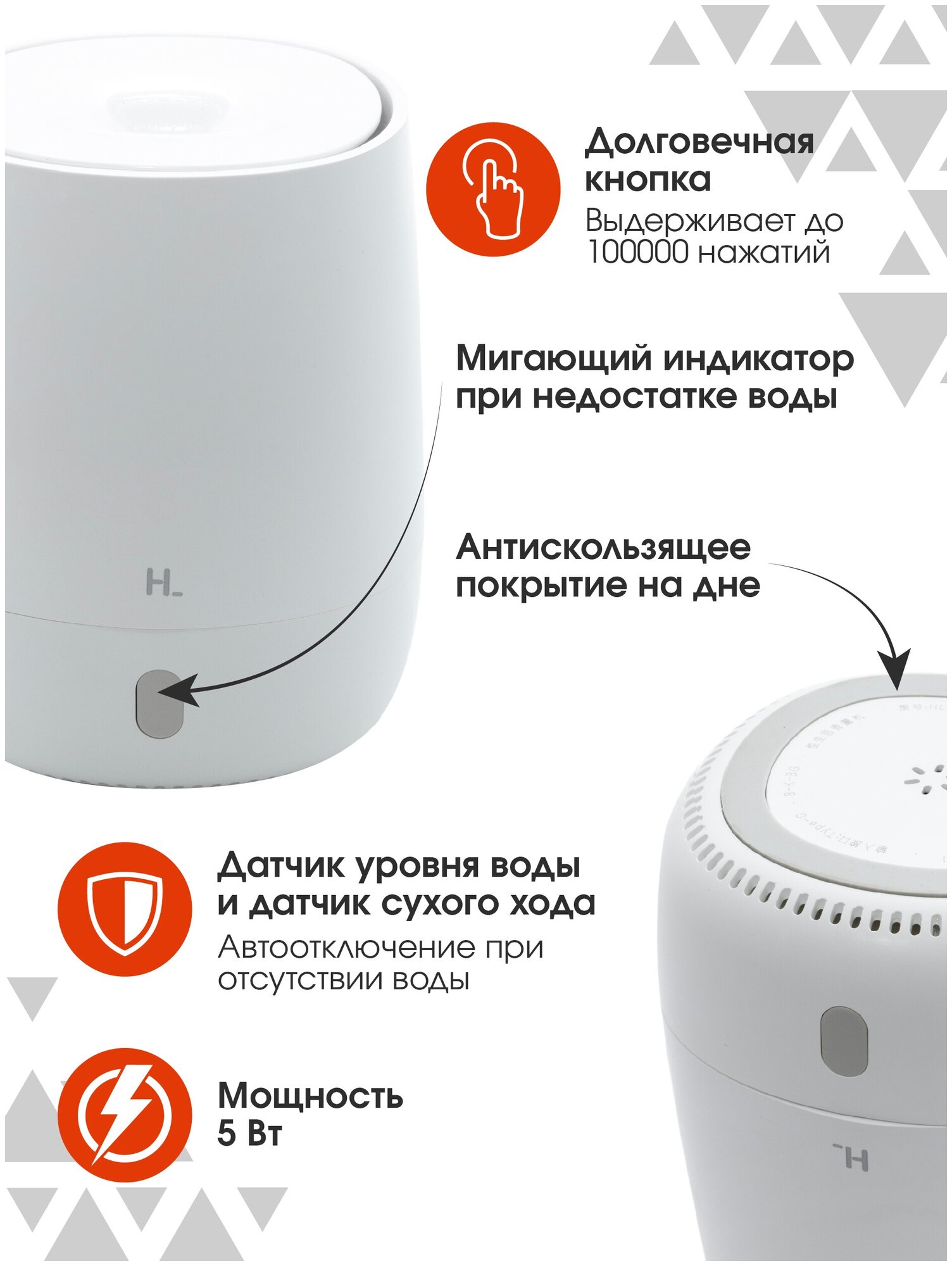 Type: aroma diffuser, room area: 20 m², type of humidifier: ultrasonic, additional functions: aromatization, lighting, filters: water, water tank volume: 0.12 l, installation: floor, table, especially