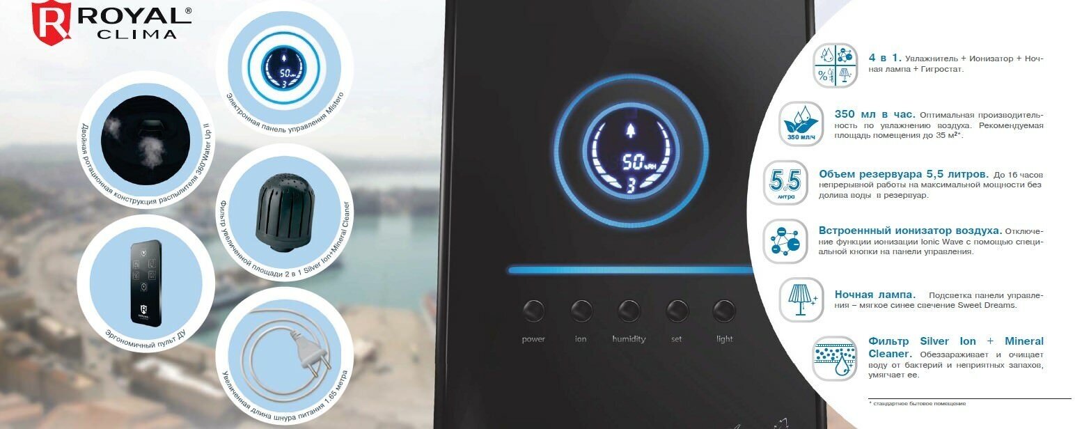 Type: air humidifier, room area: 40 m², type of humidifier: ultrasonic, additional functions: UV lamp, ionization, filters: carbon, water tank volume: 5.50 l, water consumption: 350 ml/h, installation: floor