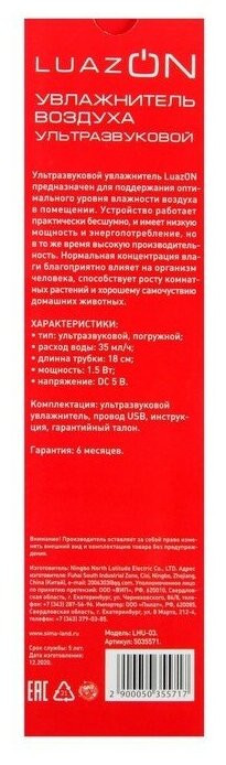 Humidifier LuazON LHU-03, ultrasonic, 35 ml/h, portable, white
