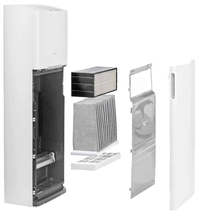 Purifier main unit, power supply, charging cable, smart controller, accessory bag, air intake and exhaust duct, user manual, spare front filter, spare lower and rear filters