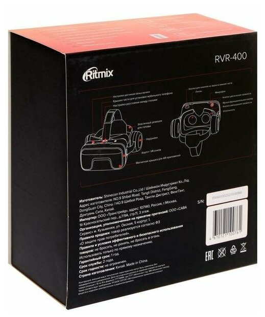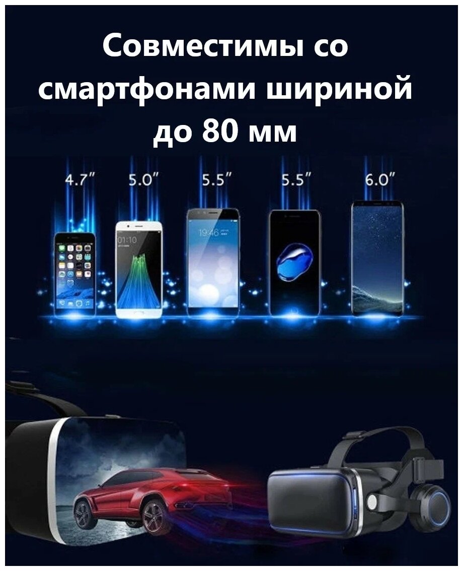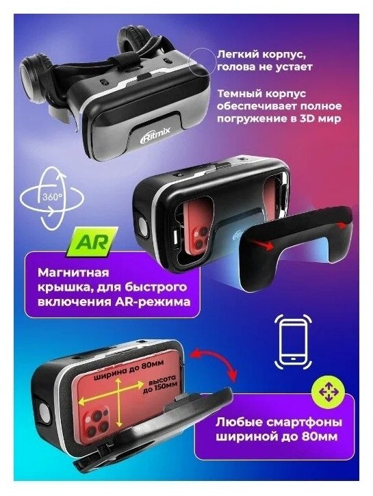 Purpose: for smartphones, compatibility: Android, iOS, features: built-in headphones, interpupillary distance adjustment, focus adjustment