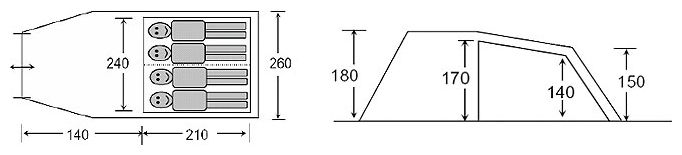 Purpose: camping, number of places: 4, features: air vents, inner pockets, inner tent, canopy, windows, taped seams, build type: outer frame, awning water resistance: 2000 mm w.c. st., count