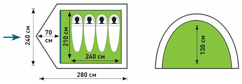 Purpose: camping, number of places: 4, features: UV protection, ventilation holes, wind / snow skirt, inside pockets, inner tent, canopy, taped seams, assembly type: outer frame