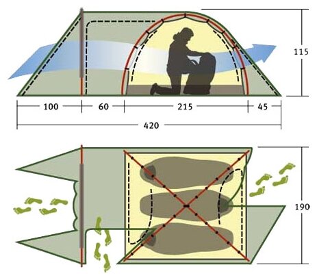 Purpose: trekking, number of places: 3, features: ventilation holes, inner pockets, inner tent, fireproof impregnation, welded seams, reinforced corners, assembly type: inner frame, waterproof