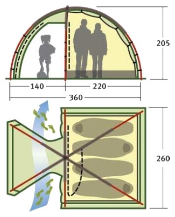 Purpose: camping, number of places: 4, features: UV protection, ventilation holes, wind / snow skirt, inside pockets, inner tent, canopy, taped seams, assembly type: outer frame