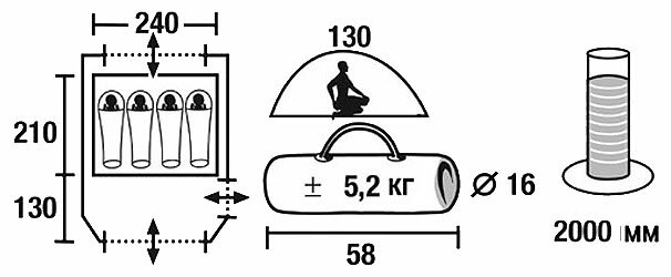 Purpose: trekking, number of seats: 4, features: UV protection, ventilation holes, inner tent, taped seams, assembly type: inner frame, tent water resistance: 2000 mm w.c. Art., number of rooms: 1, k