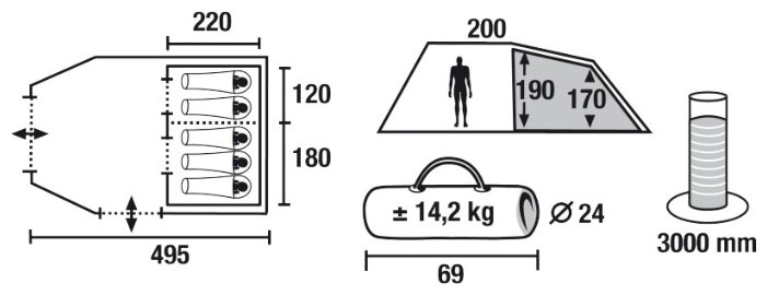 Purpose: camping, number of places: 5, features: ventilation holes, inner tent, canopy, fireproof impregnation, taped seams, assembly type: outer frame, awning water resistance: 3000 mm w.c. st., quantity