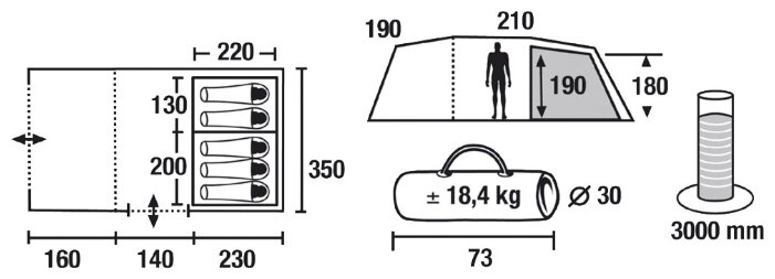 Purpose: camping, number of places: 5, features: air vents, inner tent, taped seams, build type: outer frame, awning water resistance: 3000 mm w.c. st., number of rooms: 1, number of rooms