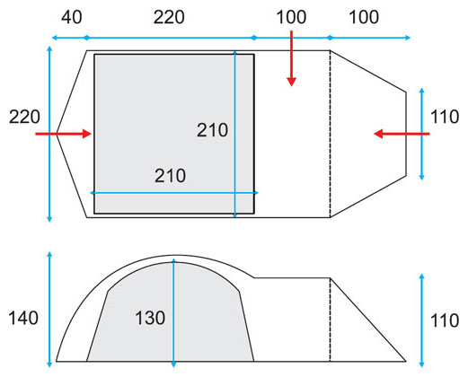 Purpose: camping, number of places: 4, features: UV protection, ventilation holes, wind / snow skirt, inside pockets, inner tent, canopy, taped seams, assembly type: outer frame
