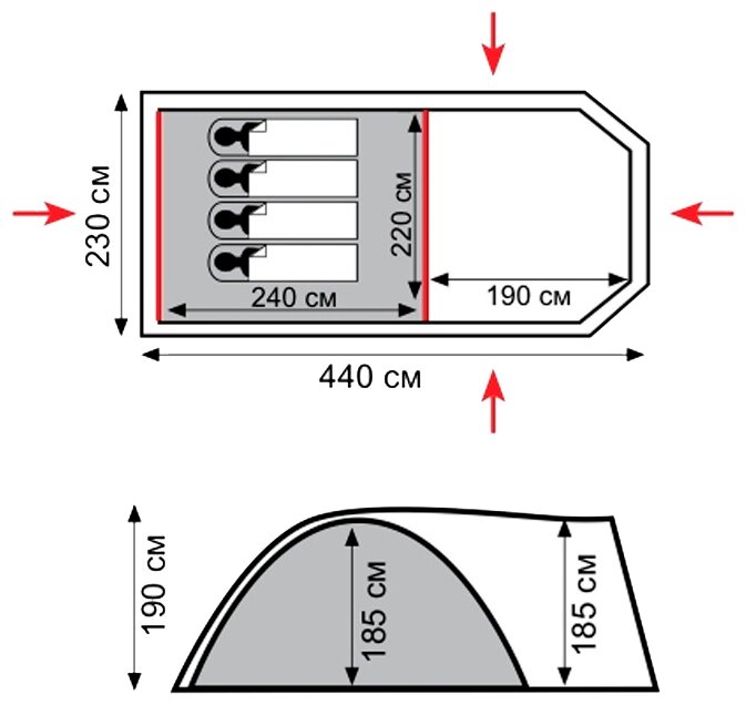 Purpose: camping, number of places: 4, features: UV protection, ventilation holes, inner pockets, inner tent, fireproof treatment, windows, taped seams, assembly type: inner frame, waterproof