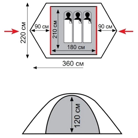 Purpose: trekking, number of seats: 3, features: UV protection, ventilation holes, inner pockets, inner tent, fireproof impregnation, taped seams, assembly type: quick-assembly, outer frame, in