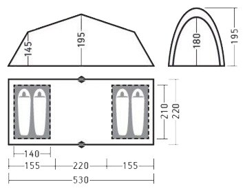 Purpose: camping, number of places: 4, features: UV protection, ventilation holes, wind / snow skirt, inside pockets, inner tent, canopy, taped seams, assembly type: outer frame