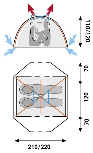 Purpose: camping, number of places: 4, features: UV protection, ventilation holes, wind / snow skirt, inside pockets, inner tent, canopy, taped seams, assembly type: outer frame