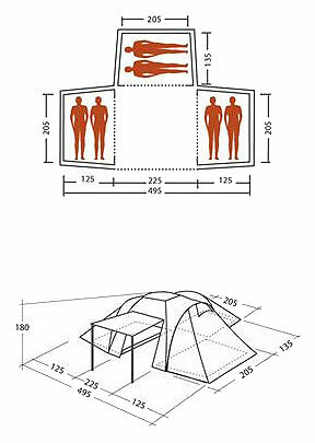 Purpose: camping, number of places: 4, features: UV protection, ventilation holes, wind / snow skirt, inside pockets, inner tent, canopy, taped seams, assembly type: outer frame