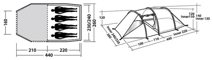 Purpose: trekking, number of seats: 4, features: ventilation holes, inner pockets, inner tent, windows, taped seams, reinforced corners, build type: outer frame, tent water resistance: 3000 mm