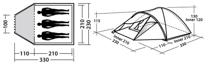 Purpose: trekking, number of places: 3, features: ventilation holes, inner pockets, inner tent, windows, taped seams, reinforced corners, assembly type: outer frame, awning water resistance: 3000 mm