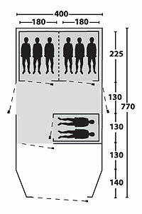 Purpose: camping, number of seats: 7 or more, features: ventilation holes, wind / snow skirt, inside pockets, inner tent, canopy, windows, taped seams, assembly type: outer car