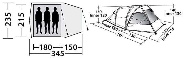 Purpose: camping, number of places: 4, features: UV protection, ventilation holes, wind / snow skirt, inside pockets, inner tent, canopy, taped seams, assembly type: outer frame