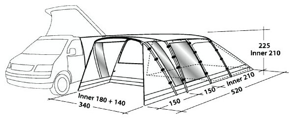 The tent can be attached to a RV; steel posts 16/19mm; packing size of arches and racks 77*19cm