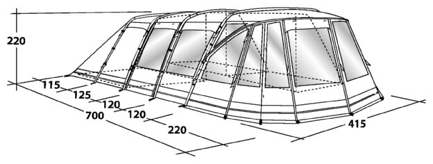 Purpose: camping, number of places: 5, features: ventilation holes, wind / snow skirt, inside pockets, inner tent, canopy, windows, taped seams, reinforced corners, assembly type: out