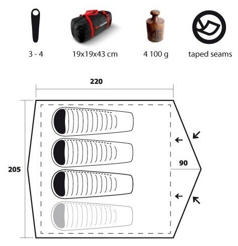 Purpose: trekking, number of places: 4, features: ventilation holes, inner tent, taped seams, assembly type: quick assembly, inner frame, awning water resistance: 3000 mm w.c. Art., number of rooms