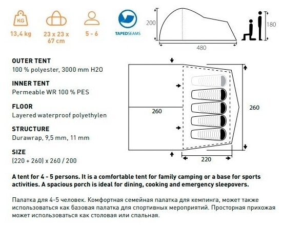 Purpose: camping, number of places: 4, features: UV protection, ventilation holes, wind / snow skirt, inside pockets, inner tent, canopy, taped seams, assembly type: outer frame